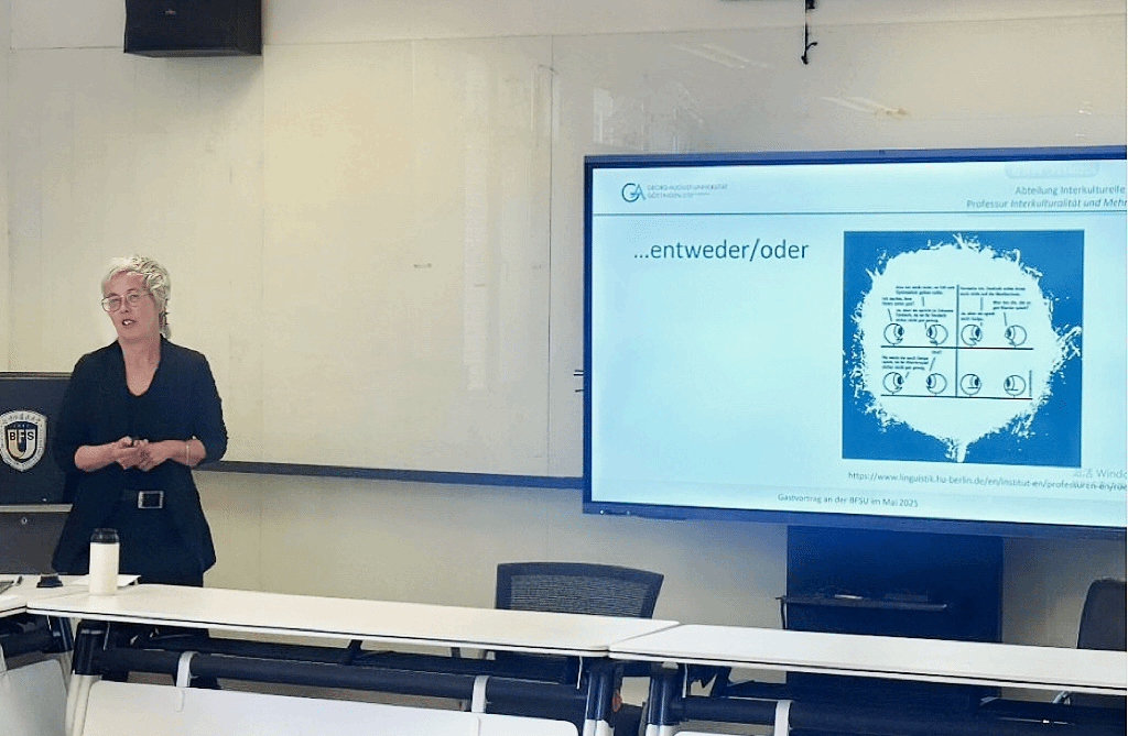 5月13日下午,三位德方教师主持了公司2025年度该项目的选拔工作。随后,Bogner教授开展了题为“反思语言与社会参与之间的复杂关联”的专题讲座,以德国多语社会为例,探讨语言政策、社会结构与教育公平之间的复杂互动,引发在场师生对语言实践与社会正义关系的深层思考。