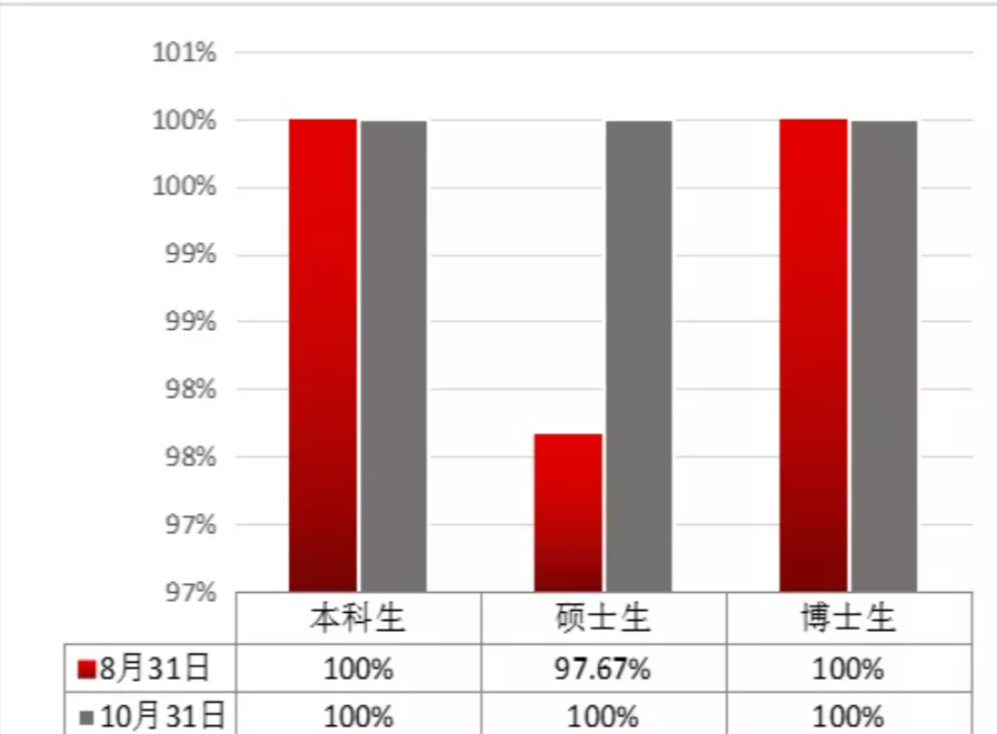 2019-2020学年,在公司党委的正确领导下,公司认真贯彻落实党中央和公司就业工作要求,探索全员、全方位、全过程的“三全就业模式”,师生同心,群策群力,攻坚就业难题。疫情期间,我们制定“抗疫情、促就业”工作方案,从“稳就业、清意向、扩领域、新方法、推实策、导方向”等六个方面,扎实开展就业工作。截止8月31日,本科生初次就业率为100%,硕博研究生初次就业率为97.67%。截止10月31日,本科生、研究生就业率均为100%,总体就业率为99.57%,居全校第二,比2019年毕业生就业率提升了15.26%。