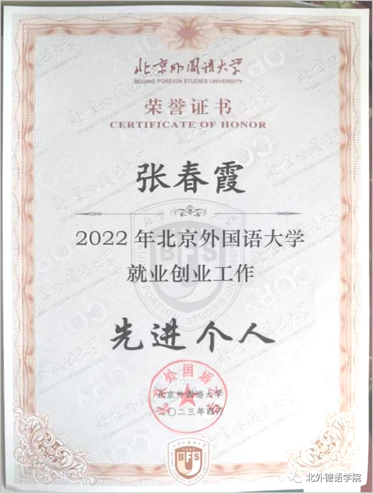 喜报 | 张春霞荣获北外2021-2022学年就业工作先进个人