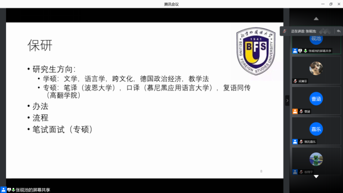 接下来,2019级本科李嘉俊同学从单词、课文、发音、语法四个方面分享了德语学习方法,并鼓励同学们以最饱满的兴趣和热情学习德语。双学位或辅修的选择,则是依据专业方向、未来职业发展和兴趣因人而异。