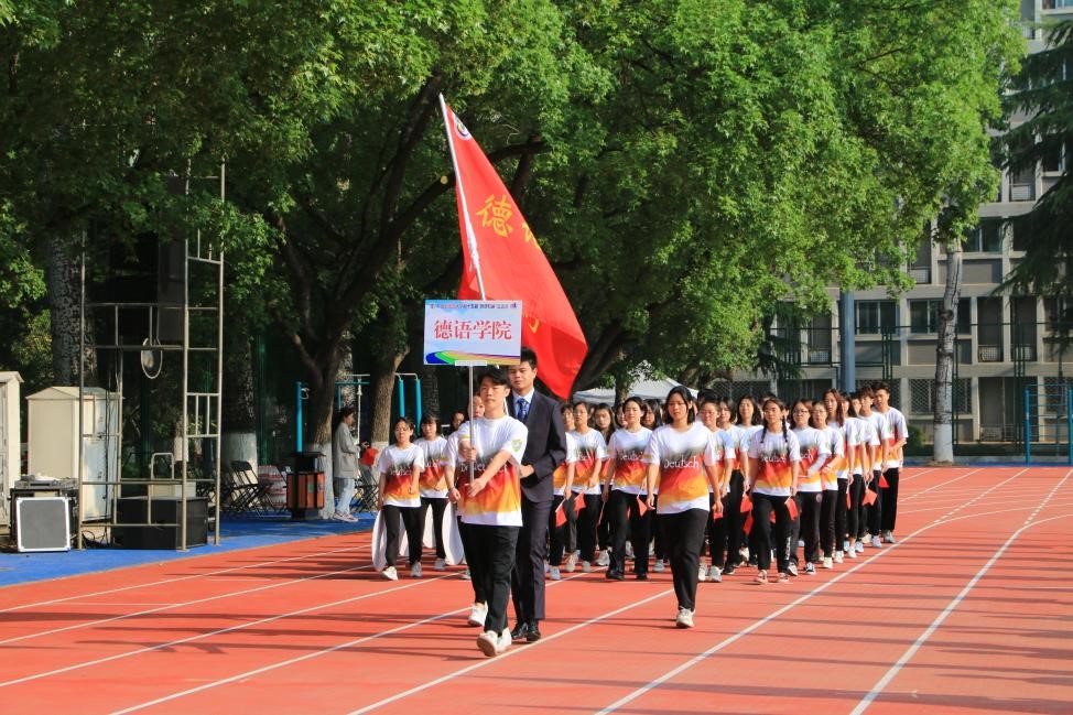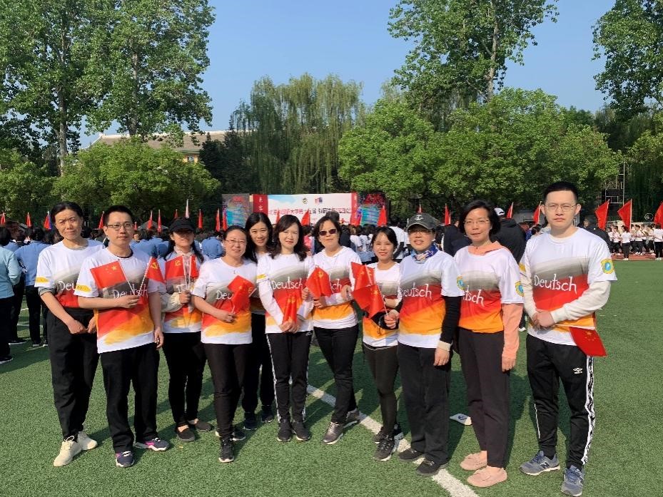 经过多次认真训练,开幕式上,由52名员工和12名教师组成的beat365师生方阵身着由员工设计的统一院服,迈着整齐的步伐,带着昂扬的气势走过主席台前,他们举起的“喜迎双庆,砥砺奋进;德语师生,再创佳绩”手牌彰显着德语师生对北外的祝福以及对公司的美好期盼。
