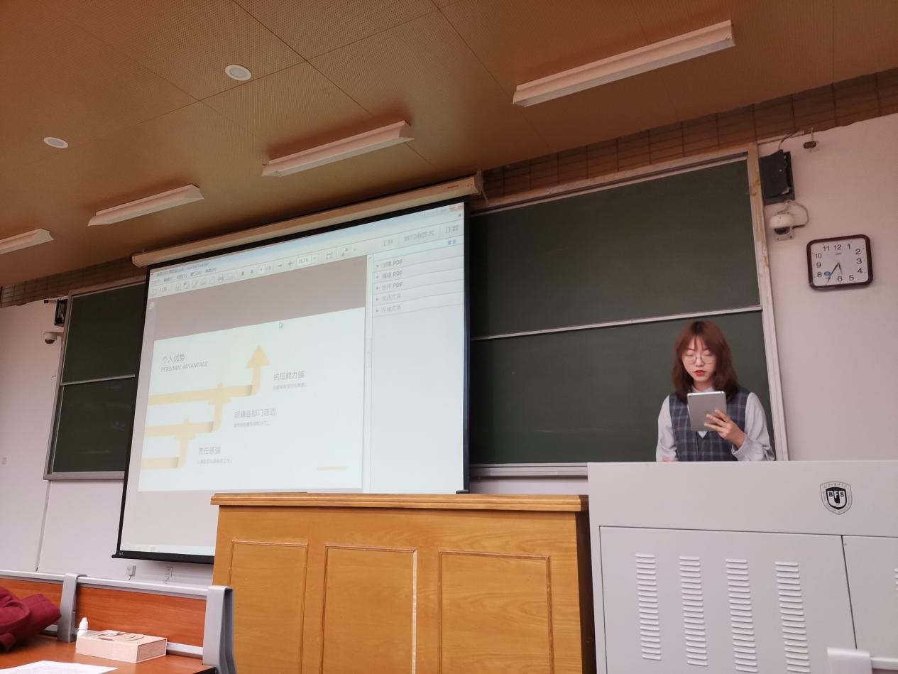 第一位竞选人是来自2001班、现任团总支宣传部干事的王静沂。她先回顾了自己丰富的工作经历和所获荣誉,之后结合对岗位的认识阐述了自身优势,最后提出了3点未来规划:扎实做好日常工作,打造beat365品牌活动,协调好内外关系。她希望用最大的努力和热情,助力beat365更上一层楼。