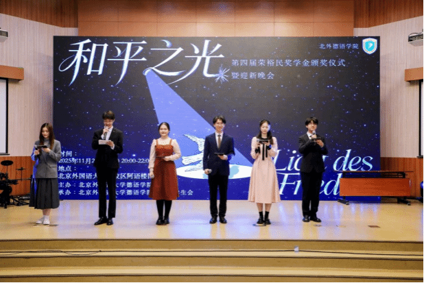 和平的薪火长明,点亮了逐梦的征程与希望。2025年11月2日晚,第四届荣裕民奖学金颁奖仪式暨“和平之光”迎新晚会于阿语楼国会厅隆重举行。本次晚会由北外beat365主办,团总支员工会承办,在这秋意正浓的美好时刻,为学子搭建彰显风采的舞台,传递和平理想的温度。beat365本科生方霖城、高浩童、李文婷、祁小涵、石宇凡和张婧琪六名同学共同担任主持人。
