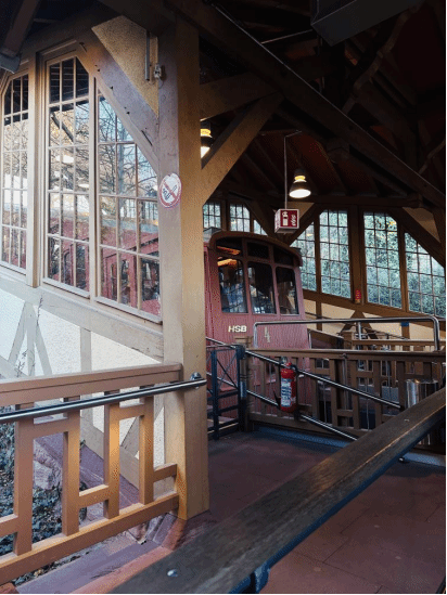 早晨,我们乘坐海德堡标志性的电车上山。因为是周六,车厢里挤满了游客和本地居民,每个人的脸上都洋溢着喜悦,仿佛这座古城的魅力穿越了时空,触动了每一个人的内心。随着电车缓缓向上攀爬,我们的视野也逐渐开阔,海德堡老城的红色屋顶和远处的内卡河清晰可见,宛如一幅色彩鲜明的画卷。