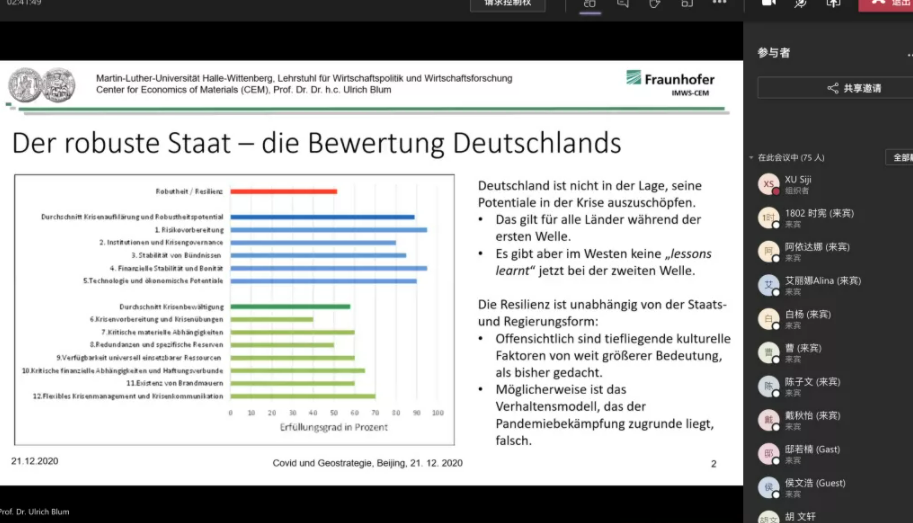 2020年12月21日傍晚,beat365德国经济专题讲座“后疫情时代中美欧经济新格局”以线上会议报告形式举行。德国哈勒-维滕贝格大学经济公司讲席教授、弗劳恩霍夫协会材料经济中心创始负责人、beat365官方网站客座教授卜玉洗(Ulrich Blum)应邀做了专题报告。