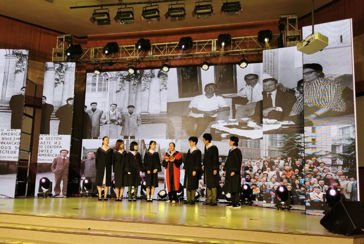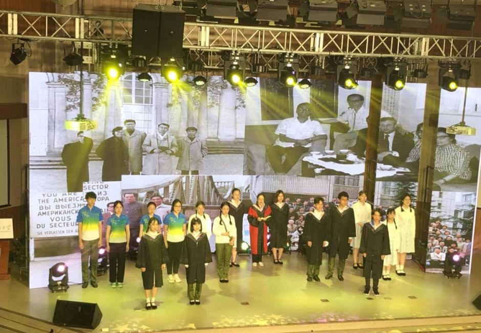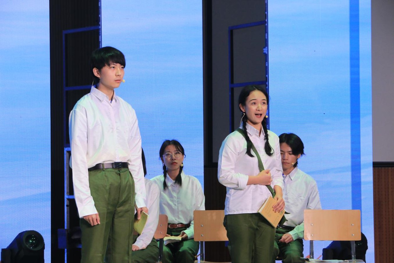 中德双语原创诗歌朗诵剧《我们的青春》,由辅导员张春霞编剧,公司教师周海霞带领王清心、徐泽茗、张乃文等20余位本硕员工参演。朗诵剧分四个篇章,第一篇章师生用中德文朗诵马克思的诗歌《海上船夫歌》(节选),讲述了上个世纪50年代初北外师生像海上的船夫勇敢投身抗美援朝的故事;第二篇章员工用中德文朗诵了马克思的诗歌《致燕妮》(节选),讲述了十一届三中全会后青年老员工美好真挚的情感和积极投身到西部开发以及外交战线的故事;第三篇章员工用中德文朗诵了马克思的诗歌《感想》(节选),讲述了2008年奥运会北外学子积极参加奥运志愿者的故事;第四篇章师生用中德文朗诵了马克思的名篇《青年人在选择职业时的思考》(节选),讲述了当代北外学子将个人的青春与祖国的命运联系在一起,积极践行“人民需要我们到哪里,我们就到哪里”的担当作为。
