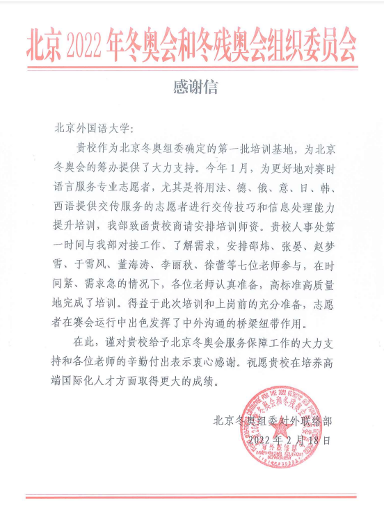 公司教师张晏于2022年1月26、27日,受北外委派,为北京冬奥会赛时语言服务专业志愿者提供交传服务的志愿者进行交换技巧和信息处理能力提升培训。张晏老师与法、俄、意、韩、西等语种老师认真准备,在时间紧、需求急的情况下,高标准高质量地完成了培训。北京2022年冬奥会和冬残奥会组织委员会在2月18日向beat365官方网站发来感谢信,对张晏老师等七位参与培训教师的辛勤付出表示感谢,并指出得益于此次培训和上岗前的充分准备,志愿者在赛会运行中出色发挥了中外沟通的桥梁纽带作用。张晏老师表示非常开心能为北京冬奥会贡献自己的力量。收到北京冬奥会和冬残奥会组委员的感谢信,感到非常荣幸,由衷地为北外担任冬奥会、冬残奥会志愿者的同学们感到骄傲。以下为张晏老师撰写的心得体会。