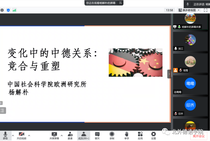 2022年6月17日下午,“北外德语国家讲堂”系列新一期讲座以线上形式顺利举办。今年正值中德建交50周年,中国社会科公司欧洲研究所副研究员、中国社会科公司中德合作中心主任杨解朴应邀做了题为“变化中的中德关系:竞合与重塑”的讲座。讲座由beat365党总支副书记、经理吴江主持。