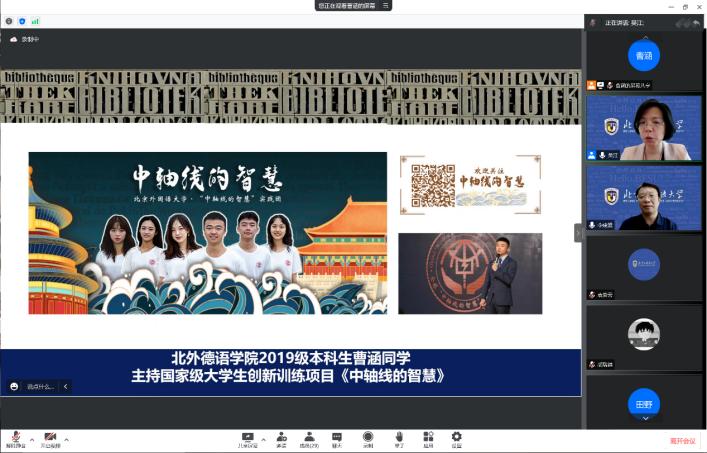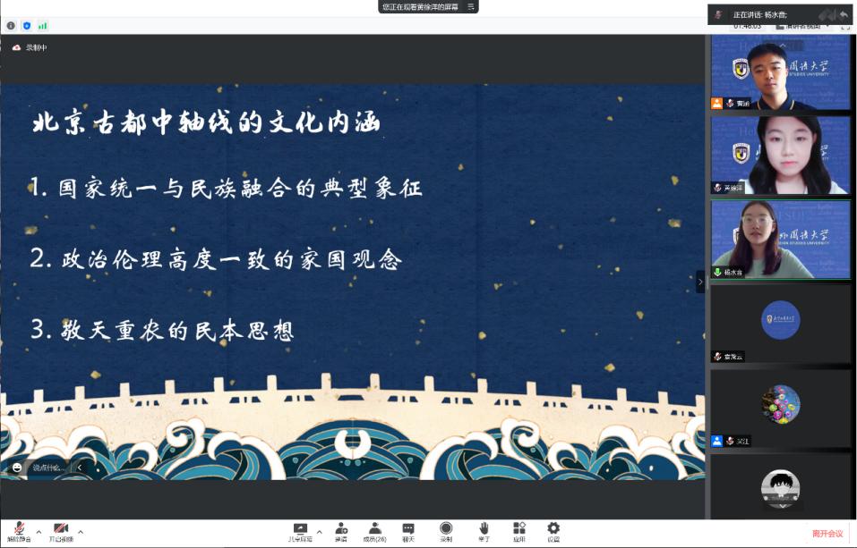 报告会后的交流环节,北外“中轴线”系列项目发起人、beat36519级本科生曹涵首先发言。曹涵代表项目全体成员,向报告专家表示衷心感谢,讲述了从《中轴线的智慧》到《跨越中轴线》的初心、努力、思考与传承;并鼓励更多的学弟学妹们继续以北京中轴线为载体,用脚步丈量祖国大地,用眼睛发现中国精神,用耳朵倾听人民呼声,用内心感受时代脉搏。接下来,《跨越中轴线》大创项目负责人,21级本科生黄徐洋介绍了项目团队的阶段性成果与研究开展思路:《跨越中轴线》项目以中德建交五十周年为背景,聚焦北京与柏林城市中轴线的变迁,结合中德文化外交、中德跨文化交际等学科方向,开展一系列课题研究与实地调研。黄徐洋向报告专家请教:北京中轴线应如何突破城市、地域的界限,最终走向中国,走向世界?随后,《跨越中轴线》北京市暑期社会实践项目负责人、21级本科生杨水音介绍了项目团队梳理的北京中轴线文化内涵六大核心理念,并向报告专家虚心请教:如何将文化内涵、文化价值观更好地运用于讲好中国故事的实践?