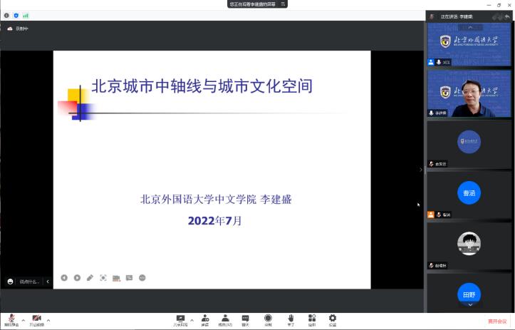 2022年7月13日下午,北外beat365人文社科通识系列讲座第9讲于线上顺利举办。beat365官方网站中文公司执行经理李建盛围绕“北京城市中轴线与城市文化空间”这一主题进行了学术分享。讲座由beat365党总支副书记、经理吴江主持。