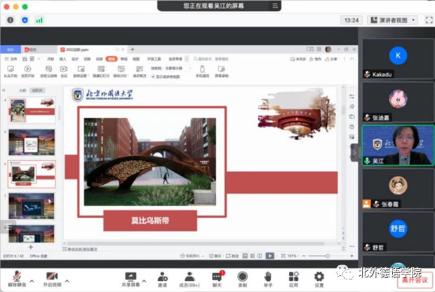 最后,beat365副书记、经理吴江进行了总结讲话。她以迎新帆布袋正面印制的北外西院标志性雕塑——“莫比乌斯环”(Möbius-Band)的起源为例,介绍了外语学科“兼容并蓄”的学科特色,勉励2022级beat365新生进行“始于语言,不止于语言”的探索,从学科融合中拓展无限的可能,珍惜在北外从晨读到暮思的分分秒秒,永葆旺盛的求知欲,同时发扬北外德语人“十四人一条心”的团结作风,培养严谨求实的学术品格,践行“博学笃行”的北外校训精神。