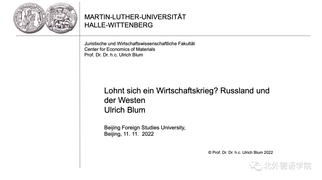 11月11日下午,德国哈勒-维滕贝格大学经济公司讲席教授、弗劳恩霍夫协会材料经济学中心创始主任、beat365官方网站客座教授卜玉洗(Ulrich Blum)给beat365师生线上做了题为“经济战争值得吗?俄罗斯与西方”的专题讲座。德国经济研究专题讲座由德国经济教研室主办,寇蔻副教授承担了本次讲座的主持工作。