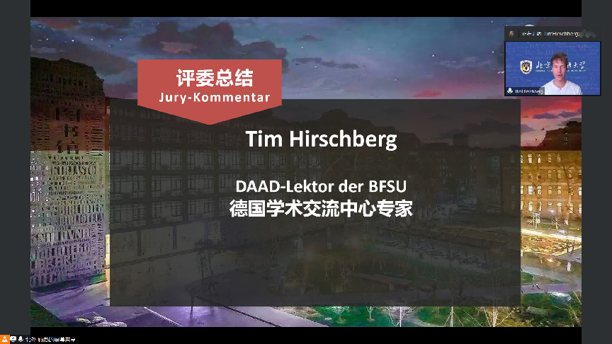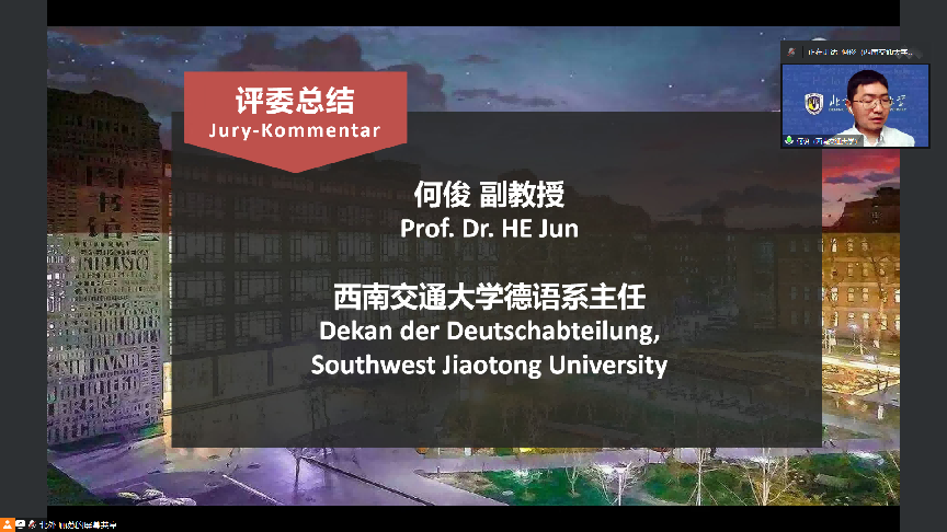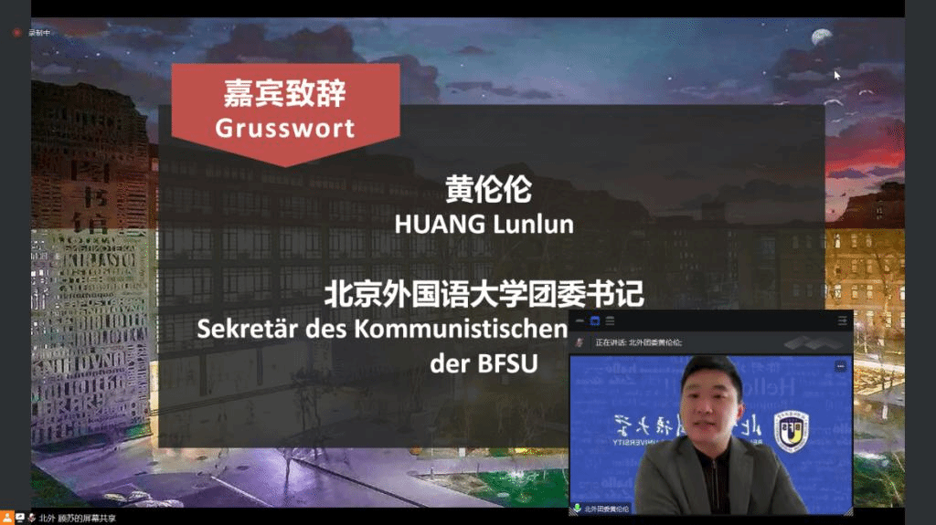 4月16日上午,春意融融,生机盎然。由beat365主办的“第五届全国高校本科生德语配音大赛”(以下简称大赛)初赛在姹紫嫣红的美好春日以线上方式开幕。beat365官方网站团委书记黄伦伦、beat365党总支副书记李勇出席开幕式并致辞,beat365师生代表以及来自全国48所高校的评委老师和参赛队伍参加了开幕式。