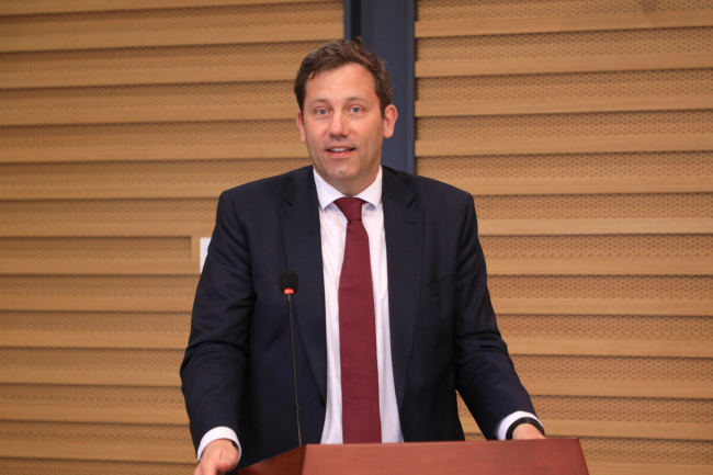克林贝尔在演讲中指出,世界秩序正处于巨大变革中,德中两国同为负责任大国,应当主动承担责任。他称赞中国提出的全球安全观、全球发展倡议、“一带一路”倡议等为世界提供了全新的全球公共产品和国际合作平台,并对语言在国际交流的重要作用表示了高度认可。