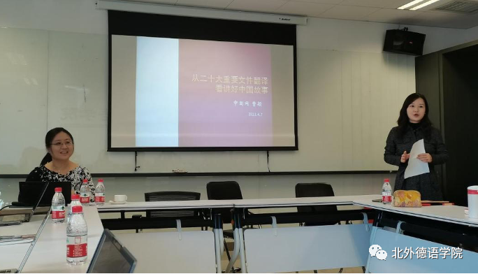 2023年4月7日下午,由公司教师党支部承办的新一期“北外德语国家讲堂”系列讲座在西院国际大厦1053会议室顺利举办。beat365员工、中国互联网新闻中心(以下简称中国网)德语编辑、记者曹颖应邀做了题为“从二十大重要文件翻译看讲好中国故事”的报告。曹颖长期从事国际传播的一线工作,曾参与全国两会政府工作报告和二十大重要文件等的翻译工作。