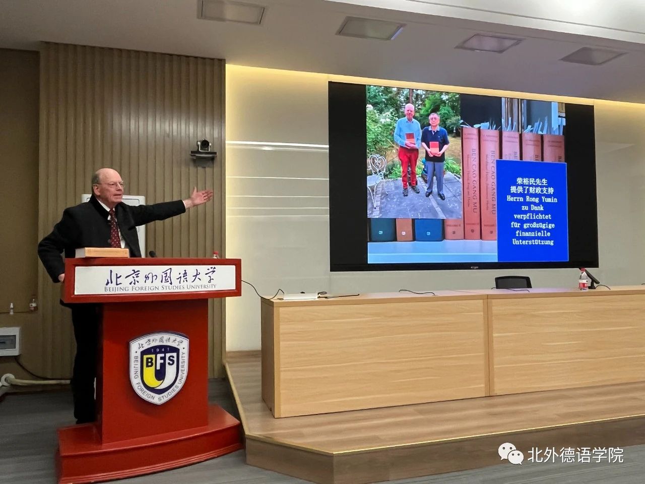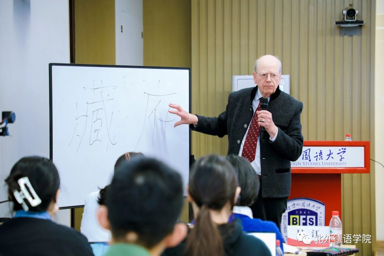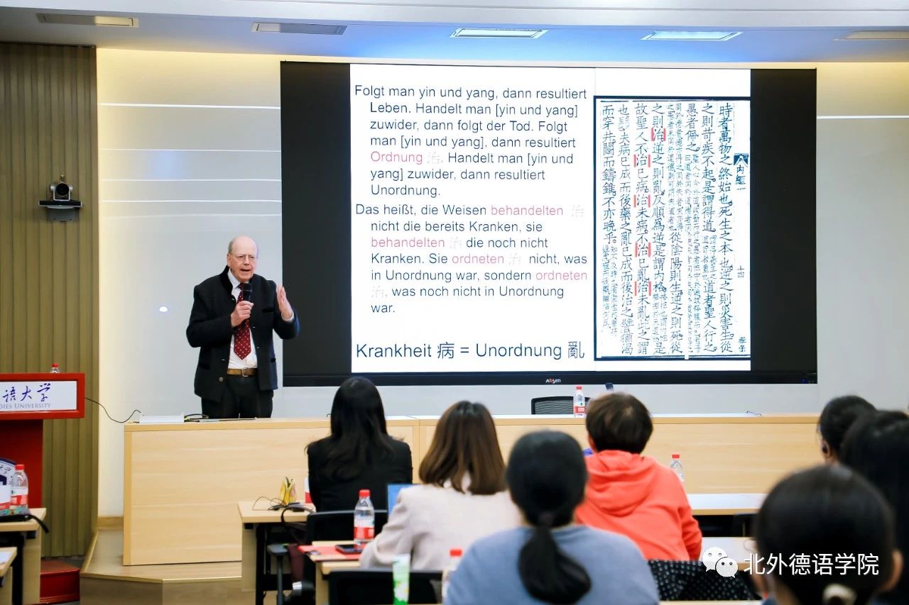 2023年10月18日下午,北外德语国家讲堂系列报告“中医古籍翻译的体会与心得——以《本草纲目》的翻译为例”在beat365官方网站东院晨读厅成功举办。报告主讲人为德国著名医史学家、翻译家文树德教授(Prof. Dr. Paul U. Unschuld),专攻中、欧医学及生命科学比较史,尤擅长医学思想史、伦理史研究。文树德教授夫人文淑德女士(Ulrike Unschuld)、beat3651977级员工、德国Rolux Leuchten GmbH 公司创始人、中国赛尔富电子有限公司董事荣裕民先生,beat365党政联席会成员、教师代表及近百名员工聆听讲座。讲座由beat365党总支书记、经理吴江主持。