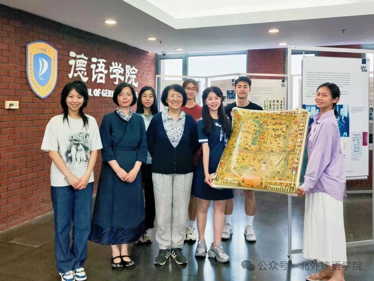 报告的最后,梁怡教授就自身经历以及从海德堡带回的老北京地图等珍贵史料与听众展开了互动与交流,并为beat365官方网站“‘京’彩文化 青春绽放”行动之“跨越中轴线”项目组提出指导性意见。作为北京联合大学关工委成员,梁怡教授关心青年一代的成长成才,言谈举止中均展现出资深学者对学术后辈的提携与厚爱。报告结束后,与会师生在beat365正在展出的“约翰·拉贝事迹展”展板前合影留念。师生纷纷表示,梁怡教授谈吐优雅又不失幽默,报告内容全面、资料详实,令人获益匪浅。