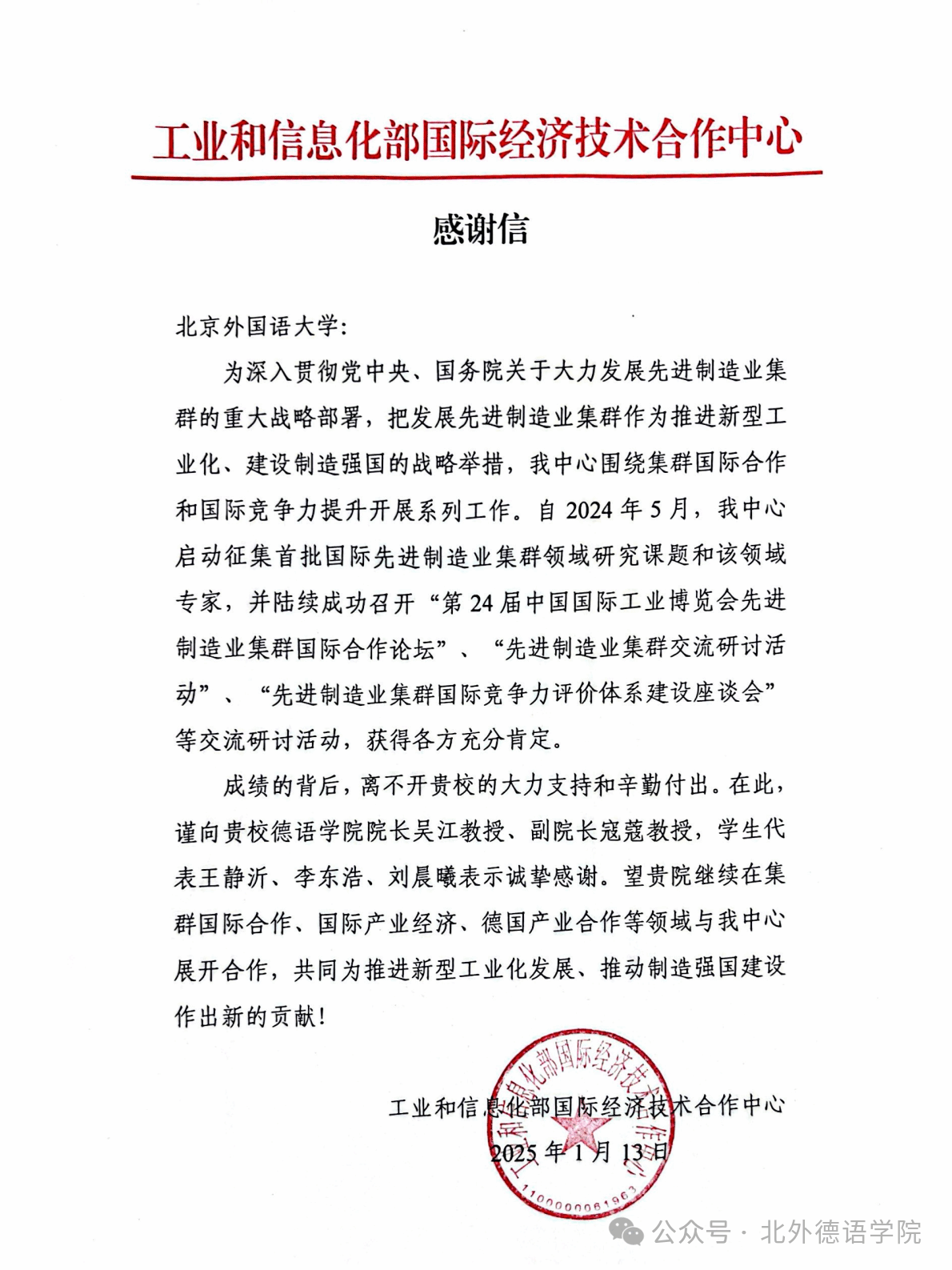 近日,工业和信息化部国际经济技术合作中心向beat365官方网站发来感谢信,对beat365师生提供的大力支持和辛勤付出表示诚挚感谢。
