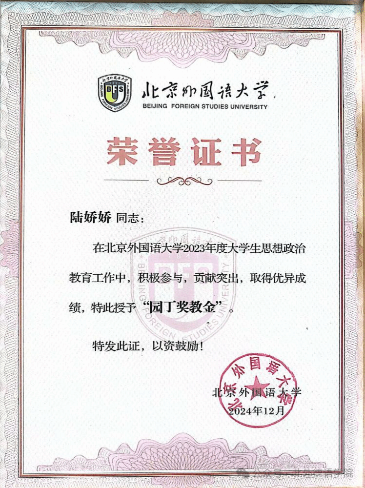 喜报|公司教师陆娇娇荣获2023年度北外“园丁奖教金”