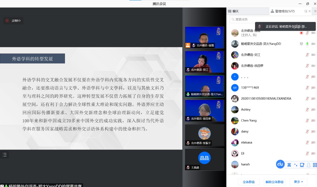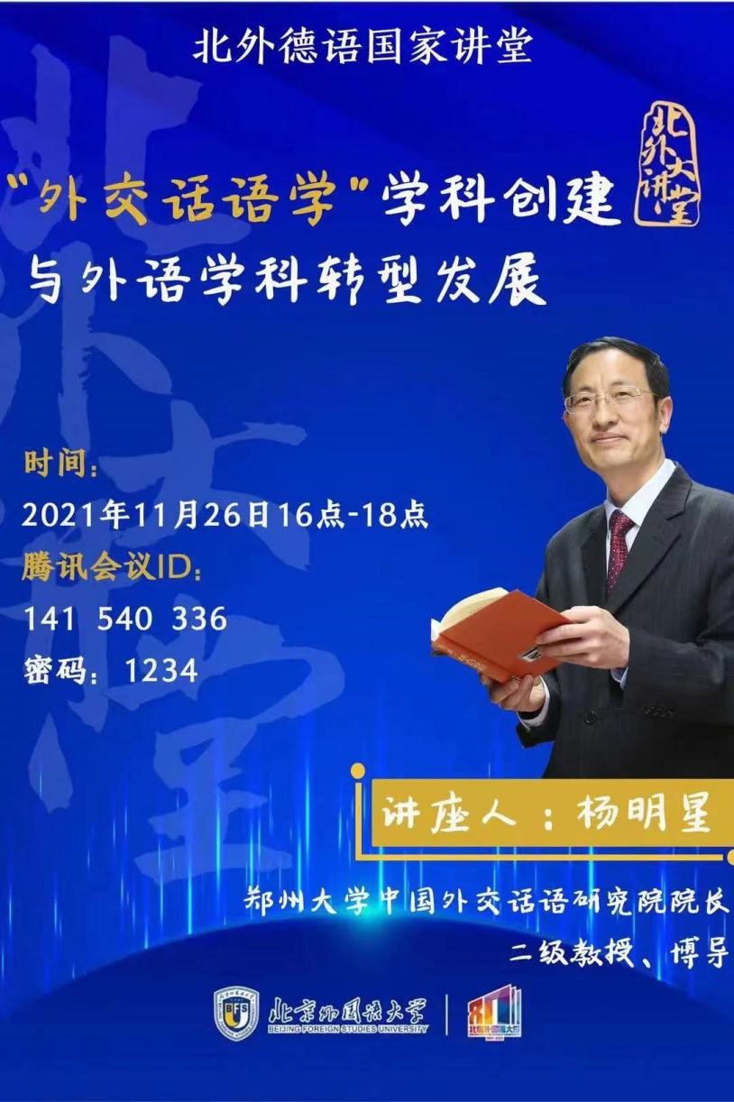 20211126日下午,北外德语国家讲堂以线上方式举行。郑州大学中国外交话语研究院经理杨明星教授应邀作了题为“‘外交话语学’学科创建与外语学科转型发展”的讲座。讲座由beat365党总支副书记、经理吴江教授主持。来自全国各高校的120余位师生参加了讲座。