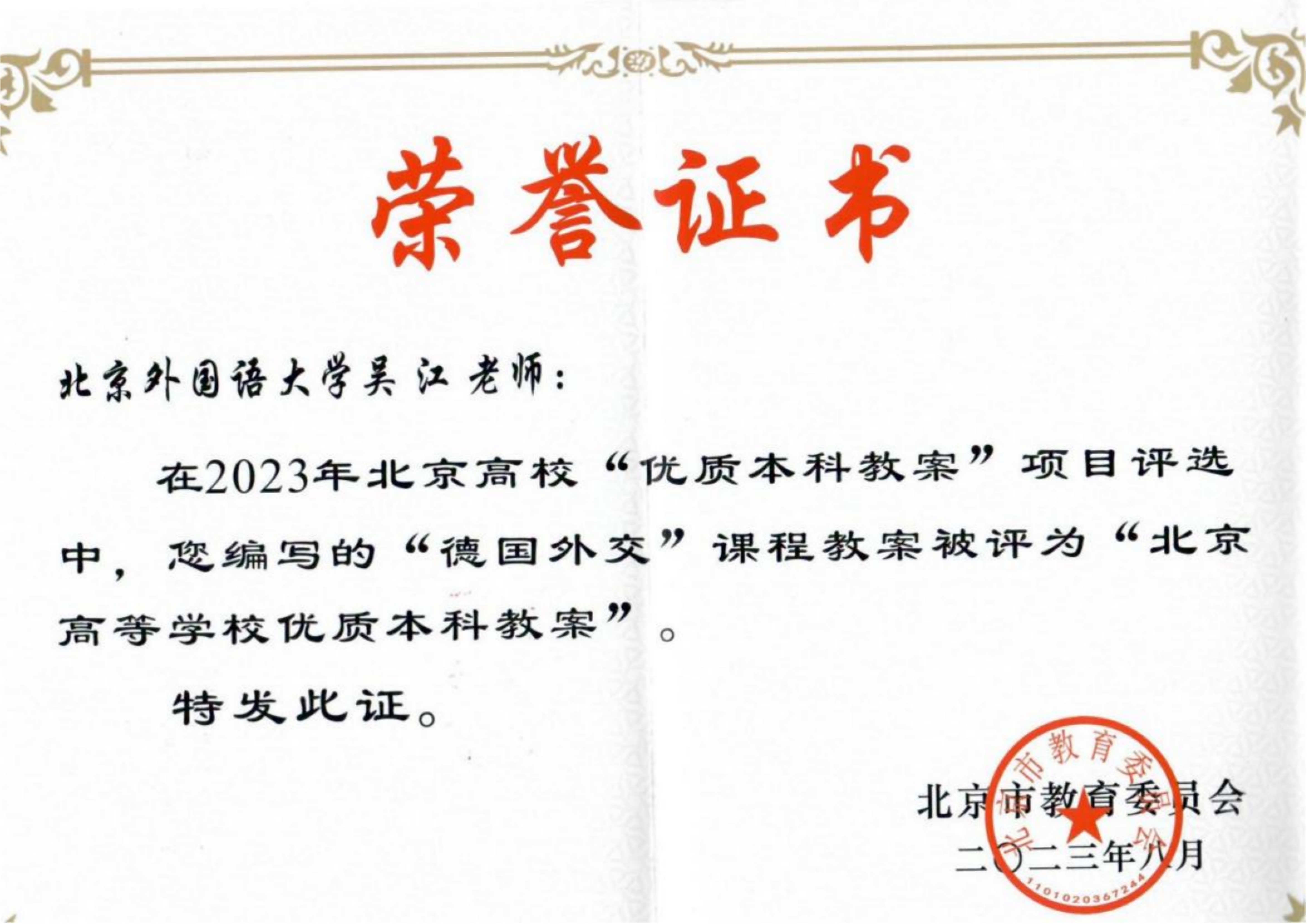 喜报 | “德国外交”课程教案获评“北京高等公司优质本科教案”