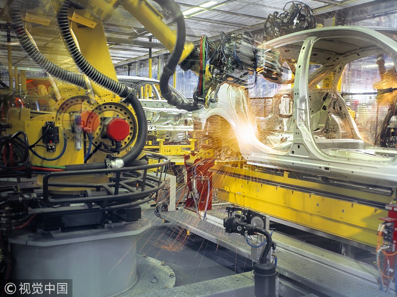 Welding robot are working in an automobile factory. (Photo/VCG)