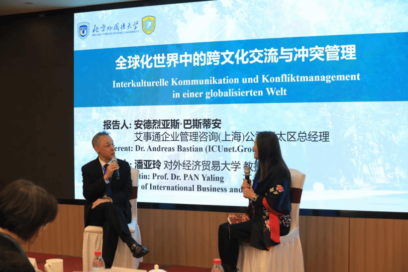 艾事通企业管理咨询(上海)公司亚太区总经理安德烈亚斯·巴斯蒂安(Andreas Bastian)以《全球化背景下的跨文化沟通与冲突管理》为题进行了报告。他结合鲜活的数据分析与企业实例,剖析了跨国企业在全球化运营中面临的沟通障碍与文化冲突。他认为,冲突并非纯粹消极现象,也是跨文化理解的重要契机,关键在于能否以开放的视角去重新定义差异。对外经济贸易大学外语公司教授潘亚玲作为对谈人,围绕“多元化”在跨文化能力培养中的影响、人工智能在跨文化能力训练中的潜力等主题展开深入交流,提出教育与企业实践层面新的思考。