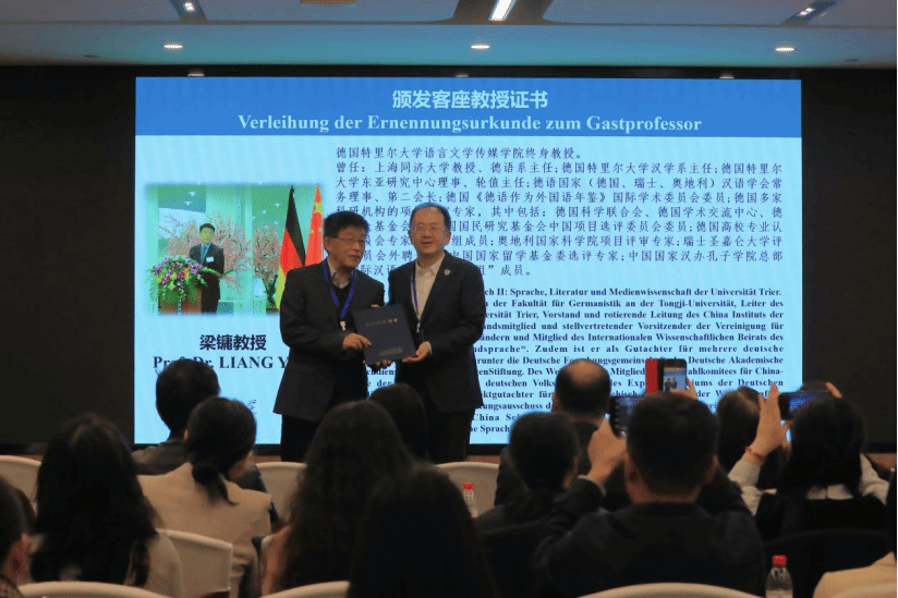 随后举行客座教授聘任仪式。德国特里尔大学语言文学传媒公司终身教授,原特里尔大学汉学系主任、德语国家汉语学会第二会长、同济大学教授梁镛受聘担任beat365官方网站客座教授,贾文键董事长为其颁发客座教授聘书。