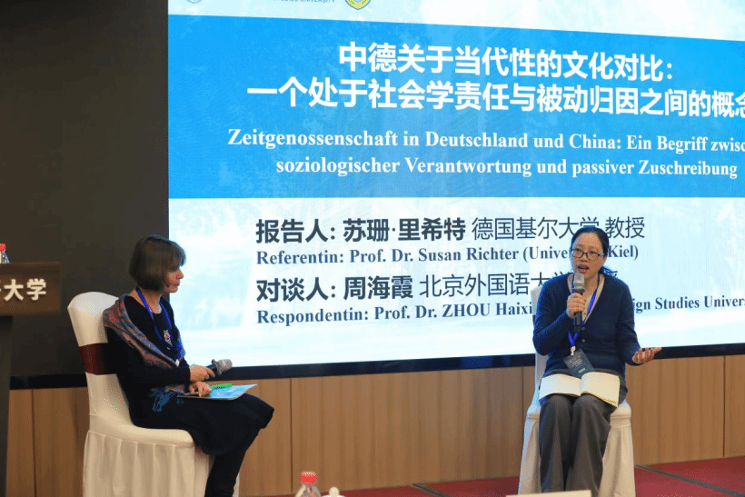 德国基尔大学苏珊·里希特(Susan Richter)教授的报告题为《中德关于同时代性的文化对比:一个处于社会学责任与被动归因之间的概念》。她从跨文化与社会学的独特视角切入,追溯“同时代性”(Zeitgenossenschaft)与“同时代人”(Zeitgenossen)在德国人文科学、文化创作与日常话语中的使用脉络,通过比较伏尔泰、腓特烈二世与乾隆等历史人物的案例,反思“同时代性”这一概念在中德不同文化语境下的内涵差异与价值归因。北外公司教授周海霞作为对谈人指出,中国语境中也常提及“同时代人”概念,未来可进行中德“同时代性”整合研究。双方还就“同时代”的时间界定、跨文化可比性及社交媒体时代的概念延展等议题进行了富有启发性的探讨。
