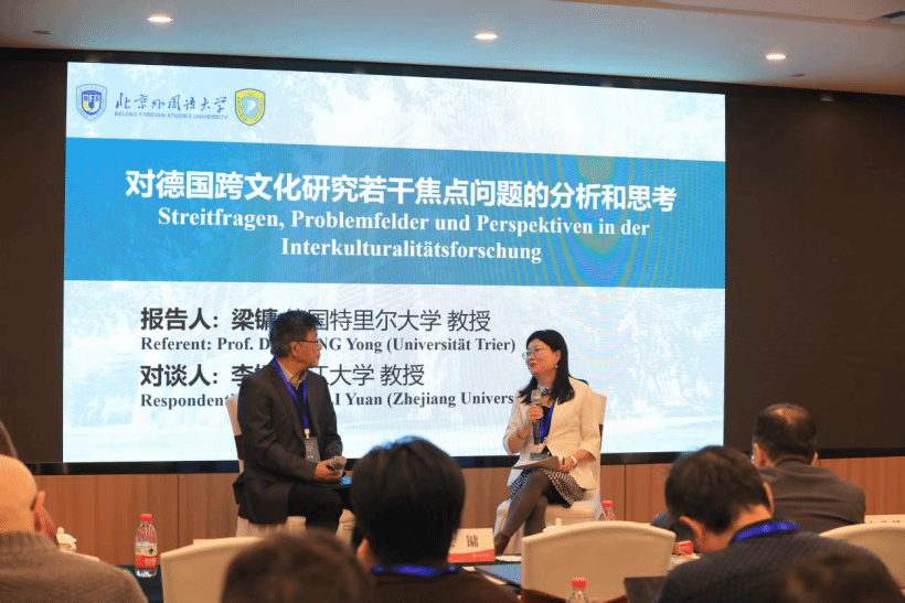 德国特里尔大学教授梁镛应邀作题为《对德国跨文化研究若干焦点问题的分析和思考》的报告。他指出,对文化同质化与本质化倾向需保持警惕,而所谓“二元对立”并非不可调和的冲突。此外,以德国媒体中的“中国形象”研究为例,他强调学界不应止步于对现象的描述,而应进一步思考如何在全球话语竞争中提升中国的形象建构能力。报告结束后,浙江大学外国语公司亚欧系主任、德国文化研究所所长、教授李媛作为对谈人,与梁镛教授就跨文化理论与实践的研究方法、批判性思维的培养以及跨文化性概念的演变展开深入对话。两位教授还探讨了数字化、人工智能对跨文化研究范式的影响,指出在语言与技术不断革新的时代,外语学科应在算法世界中持续传递人文的智慧。