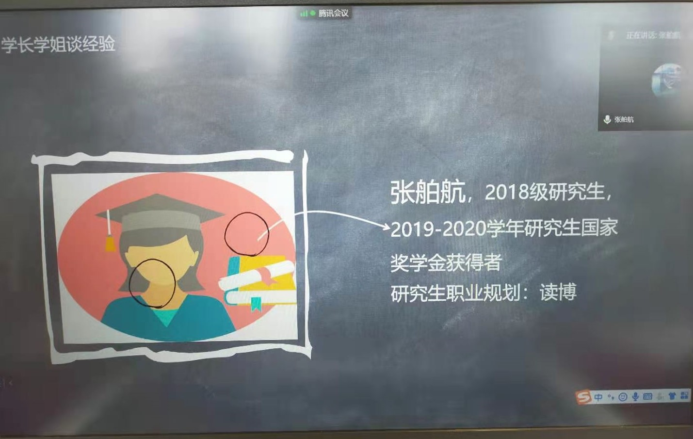 1月14日下午研究生期末会议,60余名研究生在线参加。会议邀请了研三员工张舶航、叶继琳、商健华进行经验分享。他们分别从研究生学业、职业规划,考博、求职经验等方面进行分享。之后辅导员张春霞作了“研究生职业规划”的报告。张春霞老师首先介绍了2020年北外就业质量报告的相关内容,之后对2020届、2021届毕业研究生就业情况和就业形势进行分析,结合用人单位的反馈、毕业生的问卷等对研究生的学业、职业规划提出几点建议,并解答了同学们关于学业、职业等方面的困惑。最后对假期疫情防控、人身财产安全注意事项等进行了布置和要求。