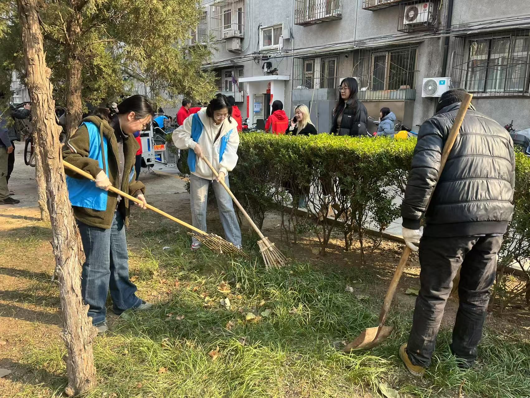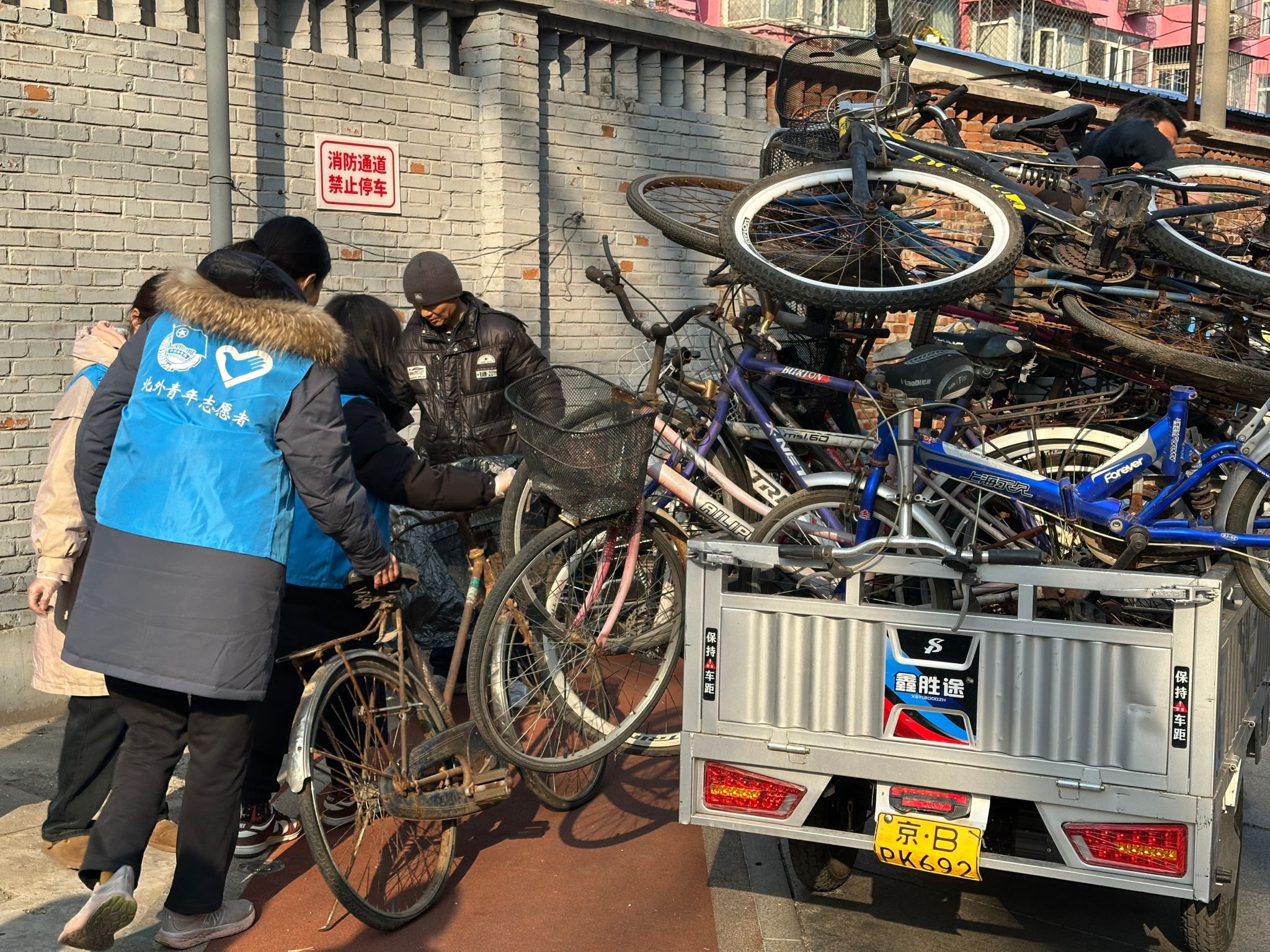 针对社区长期存在的“僵尸自行车”顽疾,beat365的志愿者们与北外社区工作人员及周边居民团结协作,展开整治行动。这些布满锈迹的车辆不仅占据公共空间,更形成卫生死角与消防安全隐患。大家协同搬运工人将废弃多年的自行车集中转运,同步清理绿化带内积存落叶。经过系统整治,腾挪出近20平方米的公共空间,让斑驳的社区绿地完整展露春色。