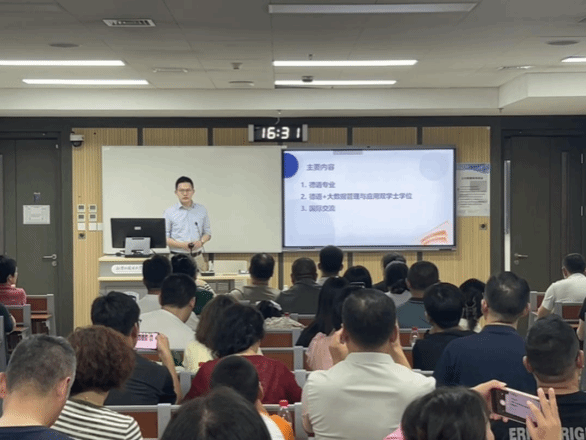 随后,beat365党总支委员、副经理寇蔻聚焦本科人才培养,为家长们详细解读本科专业人才培养方案。他指出,公司正积极推动数智赋能本科教学,以科技助力教学质量提升。并围绕本科课程体系,分别介绍基础阶段的知识夯实重点与高年级阶段的课程设置,强调高年级选课体系“动态多元”的特点,满足员工个性化发展需求。寇蔻副经理还提及北外德语专业本科基础阶段教学改革成果,重点介绍《新经典德语》教材的应用——通过教材内容设计,引导员工用德语讲好中国故事,推动中外文明互鉴;同时梳理公司重要考试安排、各类赛事资源及选拔机制,为家长清晰呈现员工成长路径。此外,针对今年第一年招生的 “德语+大数据管理与应用” 双学士学位项目展开说明,从思政育人、课程育人、实践育人三个维度,介绍该项目的德语课程、大数据管理与应用课程及交叉融合课程设置;并围绕国际化人才培养,列举交流学习项目、海外实习实践机会、国外专家讲学讲座及高水平国际交流活动,展现公司为员工搭建的国际化成长平台。