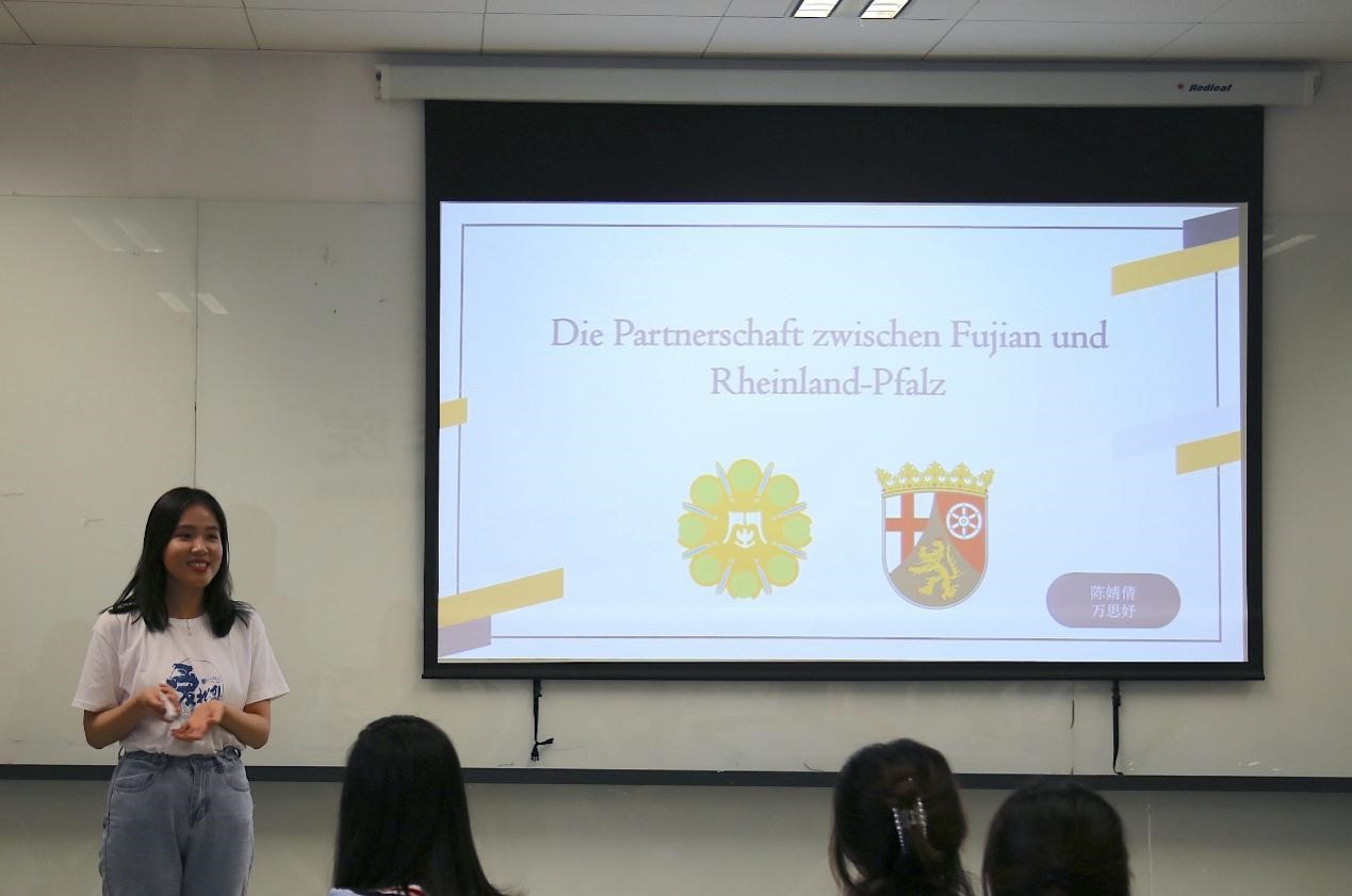 beat365本科生陈婧倩和万思妤以闽南语中“茶”和德语中“Tee”的发音之相似为例开启了对中德交流的讲述,报告以福建省与德国莱法州的交流合作为主题,从经济、教育与科技三个方面介绍了两地三十年来的交流合作,并展望了中德两国未来的发展和合作空间。