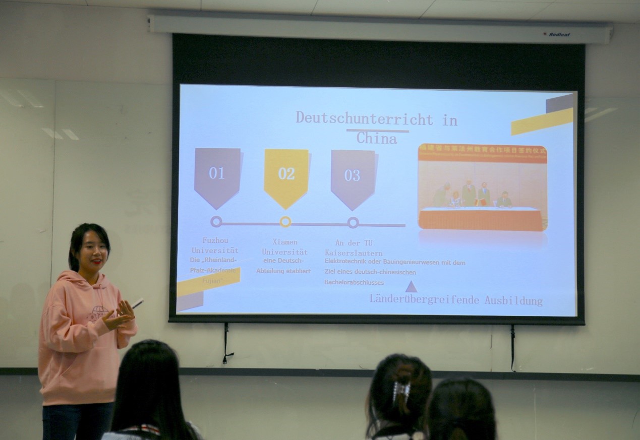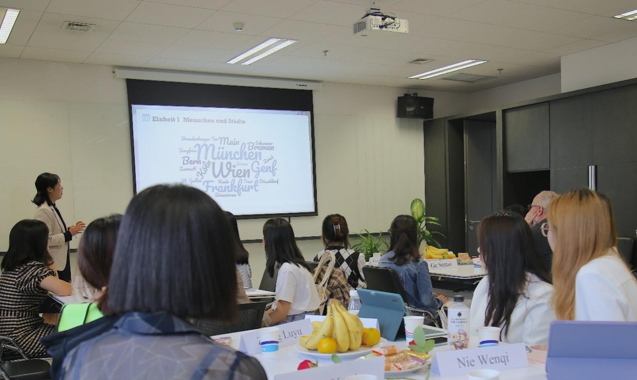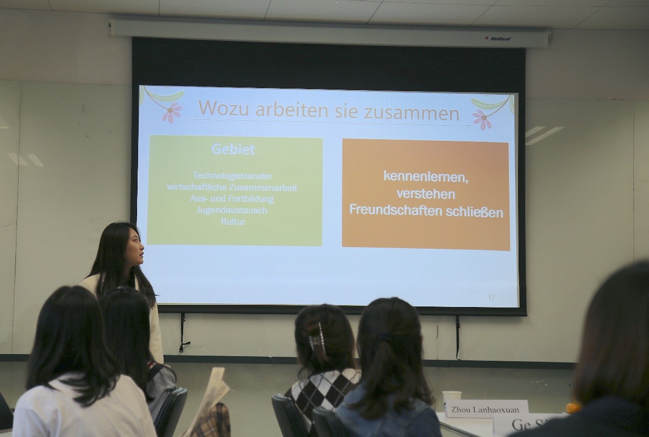 于芳副教授首先向到场的师生、员工和中外来宾表示了热烈欢迎,并简要介绍了beat365“德语国家概况课程”进行混合式教学的总体设计思路。本次公开课为“人与城市”单元线下展示阶段,以3组员工报告为主体,主题分别为中德交流合作、中奥友好城市与讲好中国故事,帮助学习者了解“省州伙伴关系/友好城市”对加强中外交流的意义,思考如何运用学到的德语知识、利用中华文化资源来去建设伙伴关系。