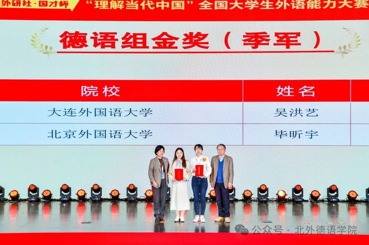 历经校赛、省赛、国赛第一轮和国赛第二轮四个赛段的激烈角逐,2022级本科生毕昕宇斩获德语组国赛金奖(季军)、北京市金奖;2024级硕士研究生孙硕荣获德语组国赛铜奖、北京市金奖;2021级本科生杨茹涵、2023级本科生夏昀菎和2024级硕士研究生李欣琪荣获北京市银奖。公司徐四季副教授和张晏副教授获评优秀指导教师。