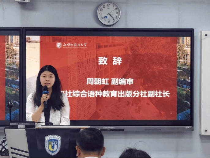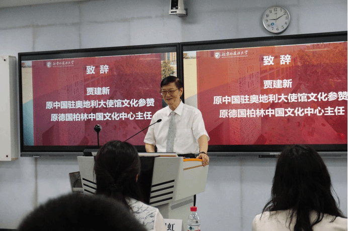 公司员工、中国原驻奥地利大使馆文化参赞、原德国柏林中国文化中心主任贾建新在致辞中充分肯定公司在推动中外人文交流、培养德语高层次人才方面所作出的突出贡献。他寄语青年学者坚定文化自信、脚踏实地地走好学术之路,努力成长为具有国际视野与文化担当的外语人才。